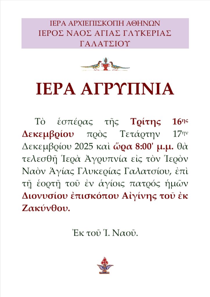 Ἱερὰ Ἀγρυπνία Δεκεμβρίου 2025